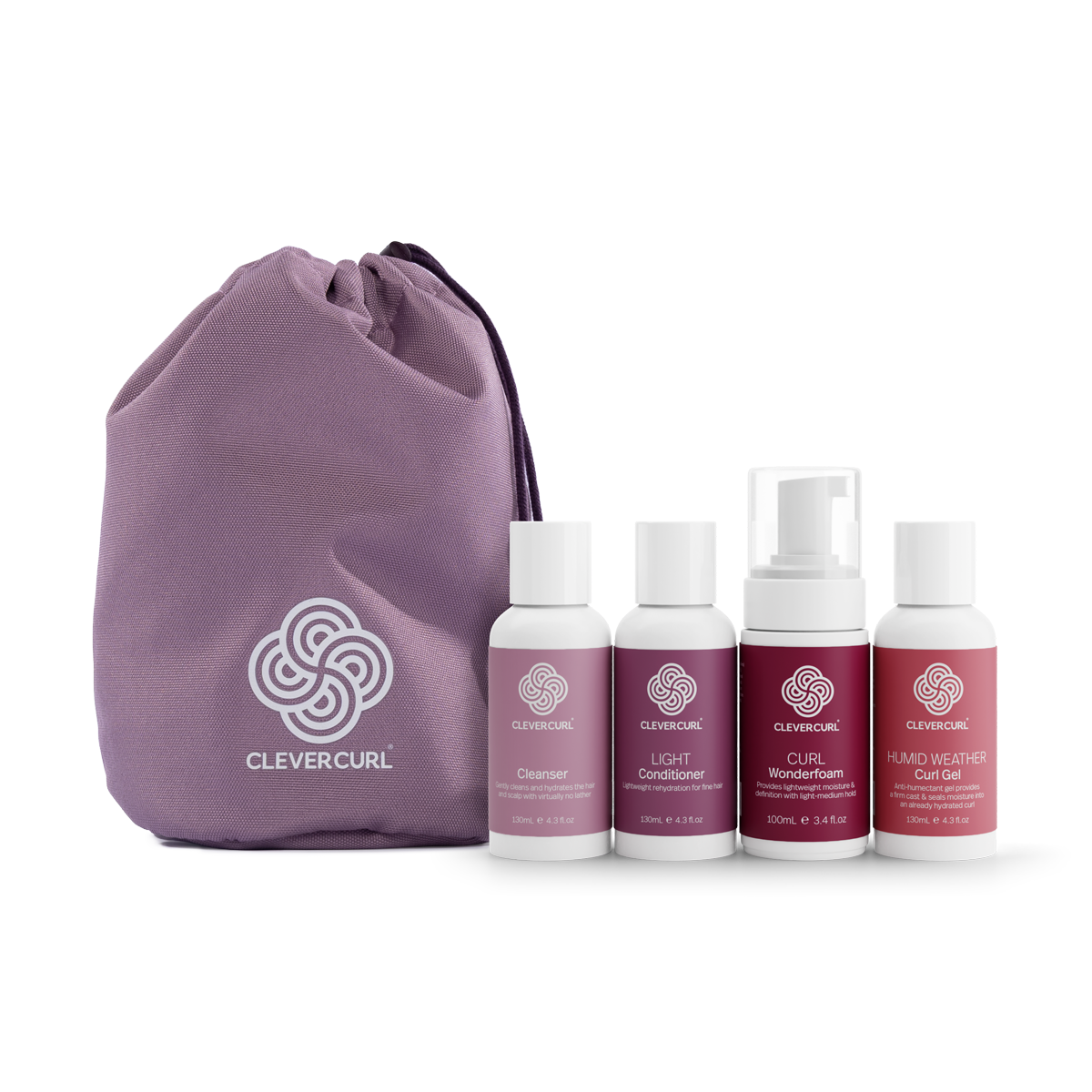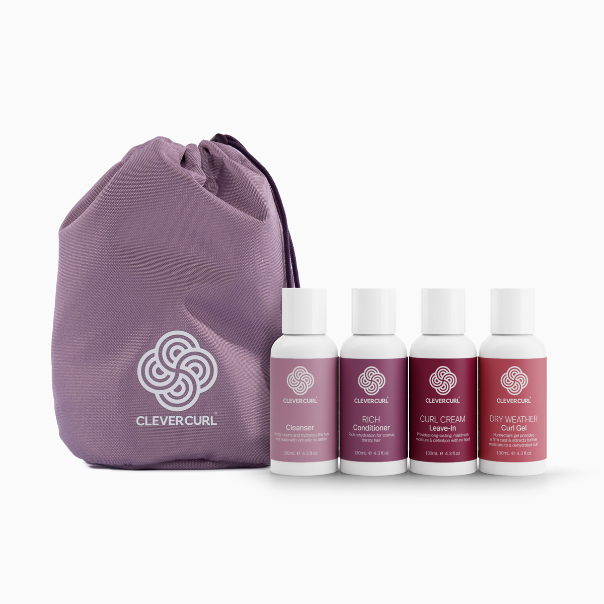 The Clever Curl Original Range is also available in compact 130ml/100ml sizes designed to test, trial and travel. The Clever Curl Light & Rich Starter Packs each contain 4 carefully selected travel sized products designed for the perfect introduction to the Clever Curl range. Packaged up and ready to take on the go in our exclusive Clever Curl drawstring travel bag!